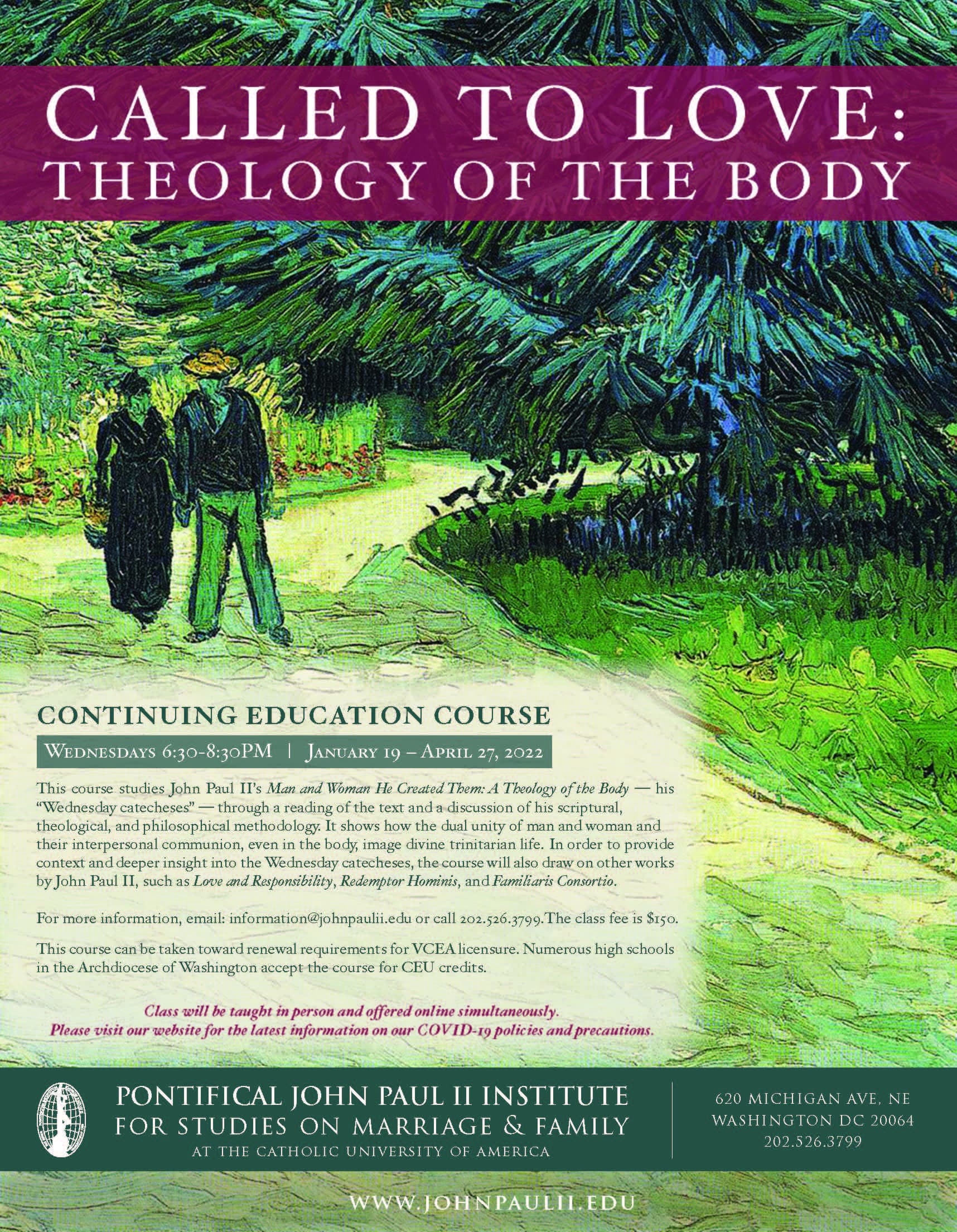 The course will be taught in person and offered online simultaneously. The in-person class meetings will be in McGivney Hall Room 006 on The Catholic University of America’s campus.